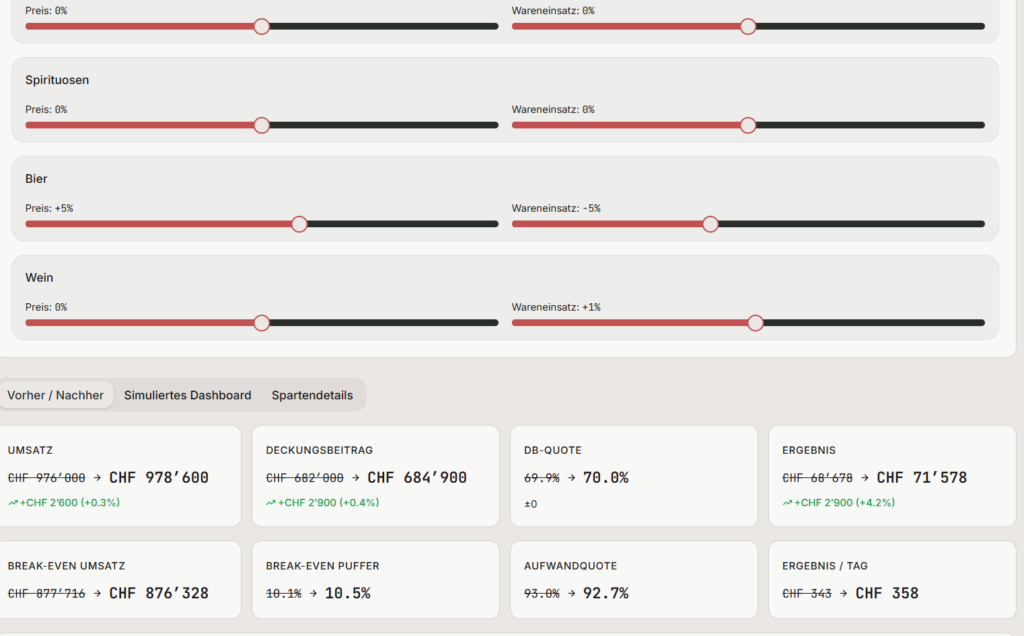 Normale Buchhaltung zeigt die Vergangenheit. Gastrocontrol übersetzt Buchhaltung in Entscheidungen – mit Dashboard, Spartenanalyse, Risiko-Logik und Simulation.