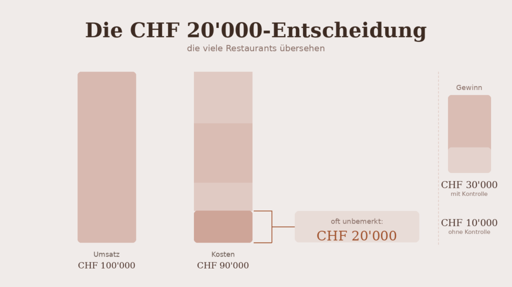Die Gastronomie ist ein Geschäft der kleinen Margen und der vielen Stellschrauben. Keine einzelne Massnahme verändert alles. Aber viele kleine Massnahmen, konsequent umgesetzt, können in der Summe einen grossen Unterschied machen — einen Unterschied von CHF 20’000 oder mehr pro Jahr.